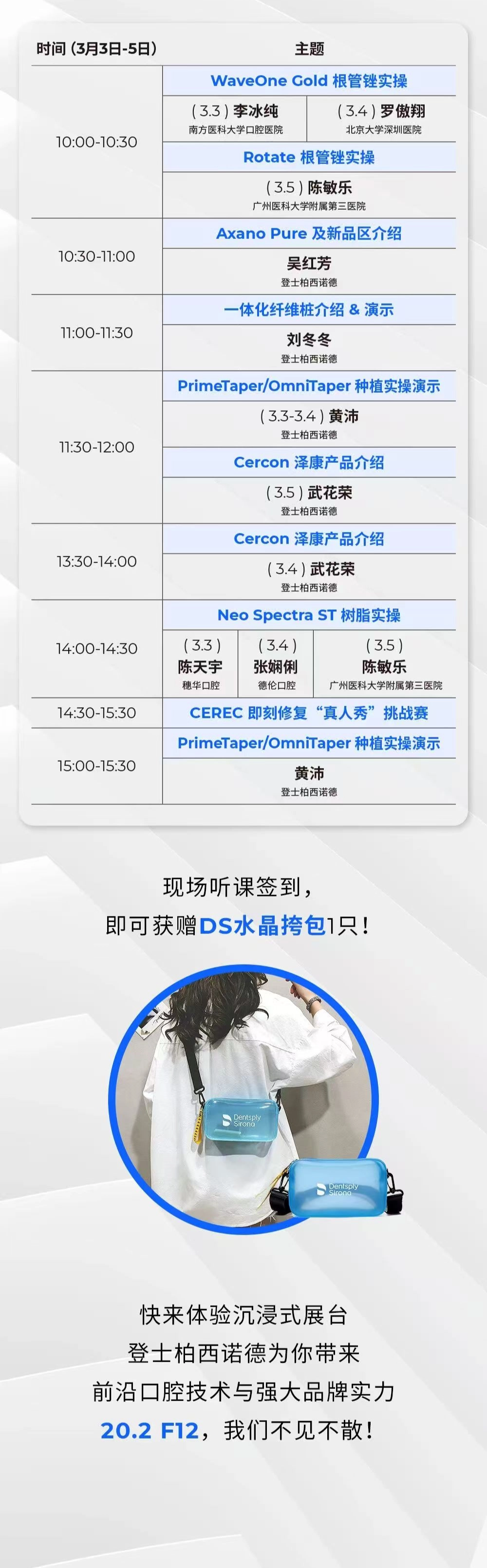 Celebrating Cercon's 25th anniversary, Dentsply Sirona will host the Cercon 25th Anniversary and New Product Launch Event from 14:00 to 17:00 on March 3rd in Meeting Room V5 of the Canton Fair Complex, open for registration to industry professionals. Multiple hands-on courses and lecturer sessions will be held during the exhibition. On-site attendance and check-in will entitle participants to receive a DS crystal crossbody bag.