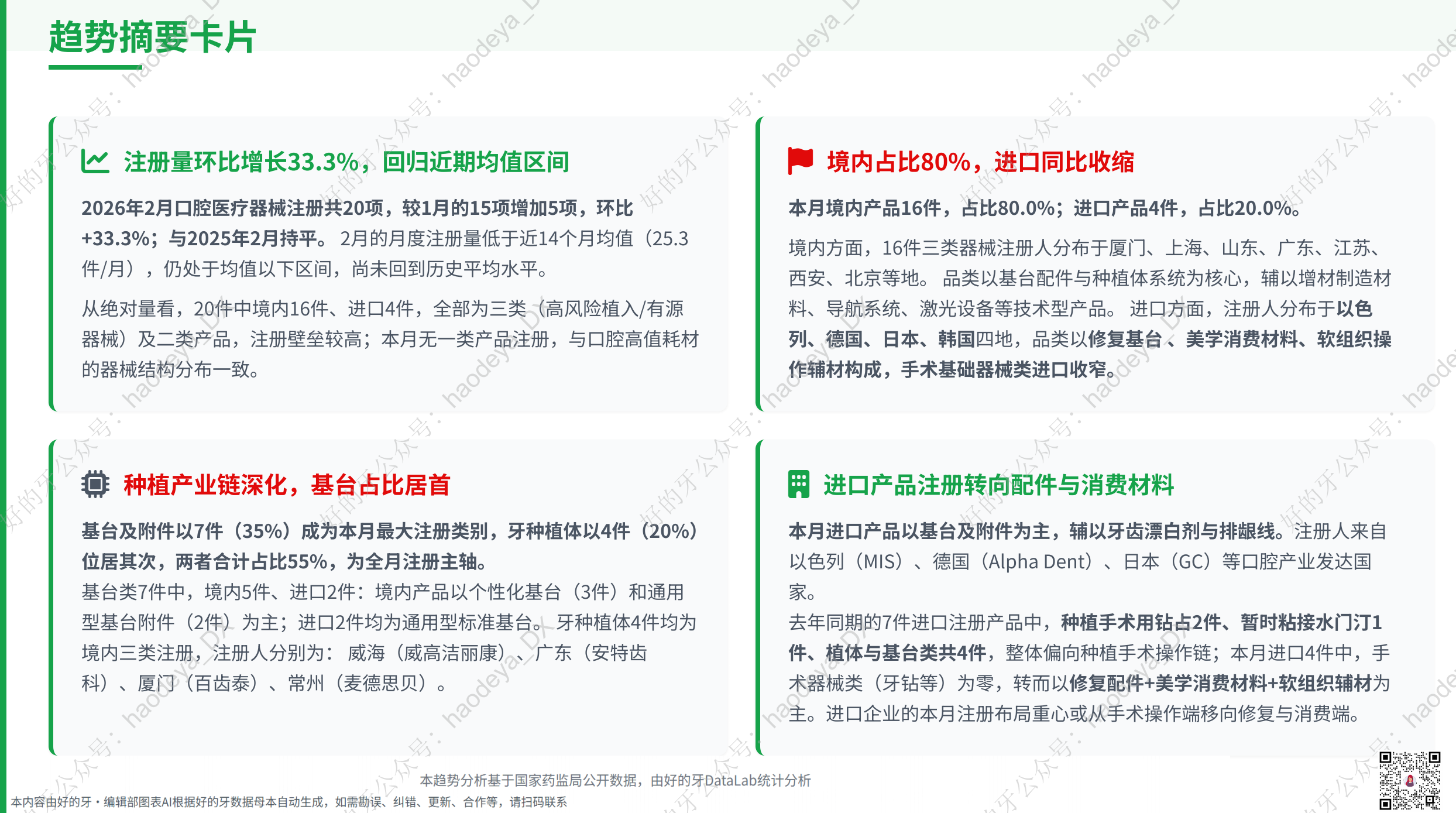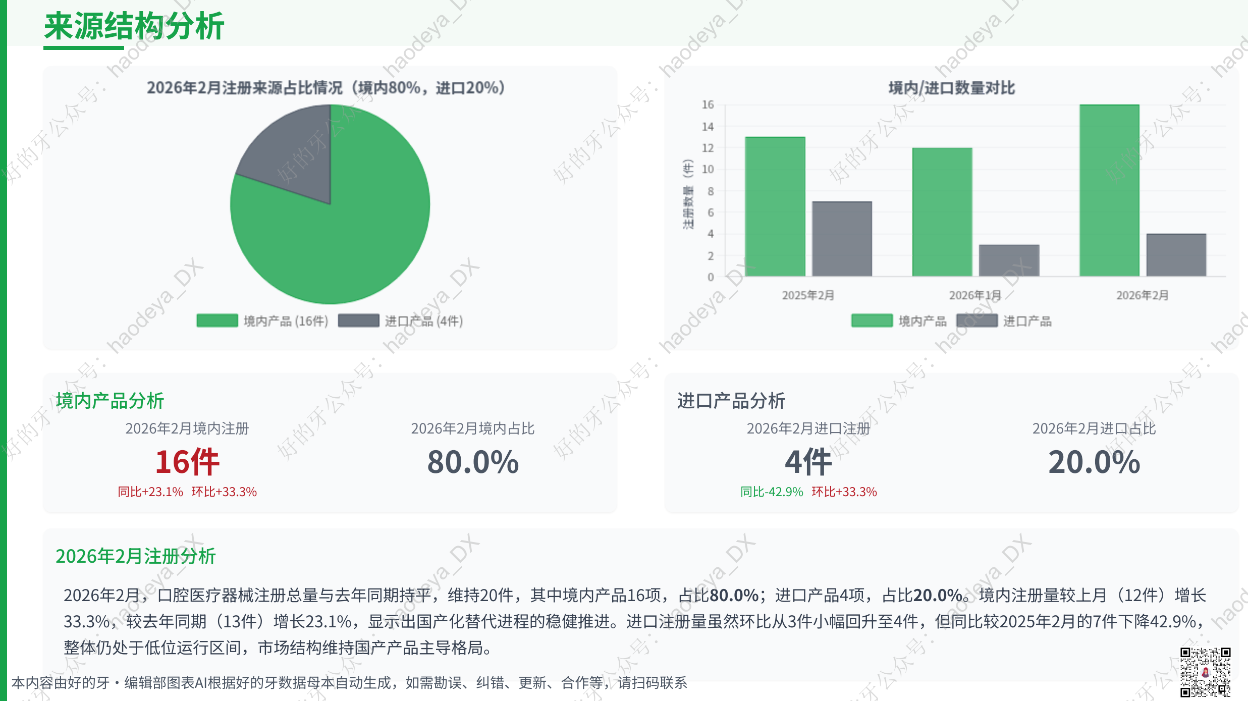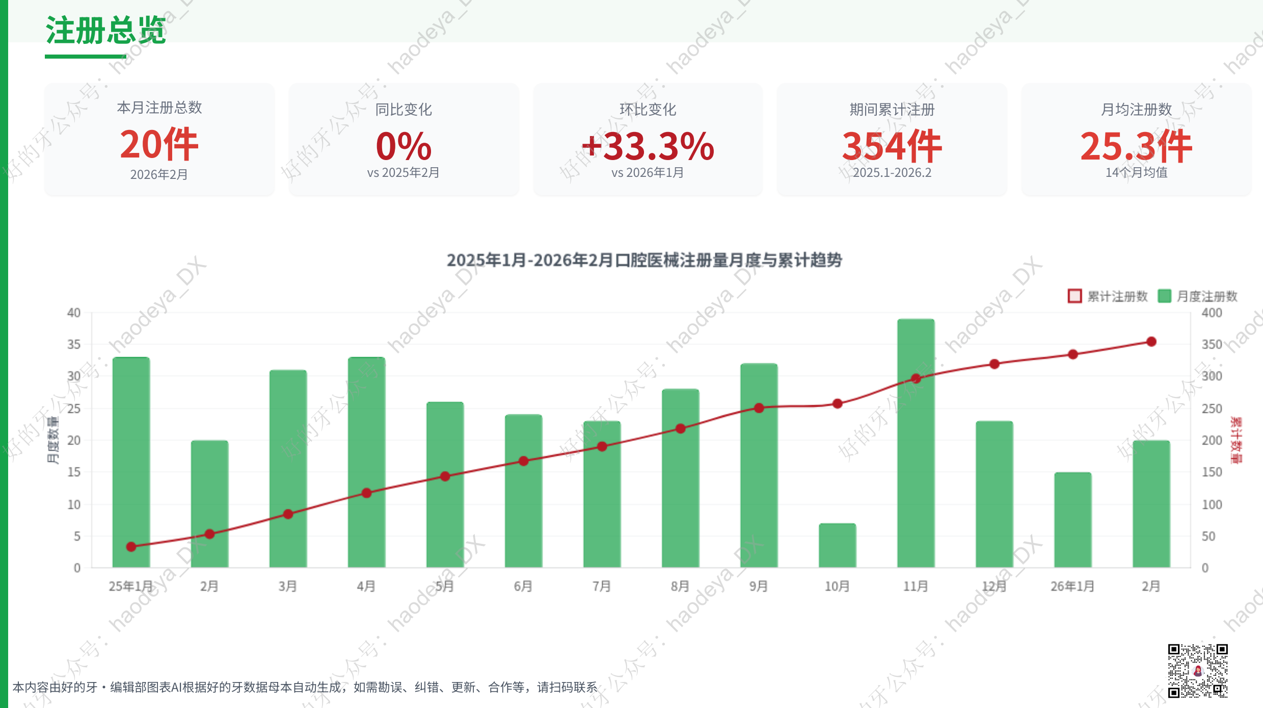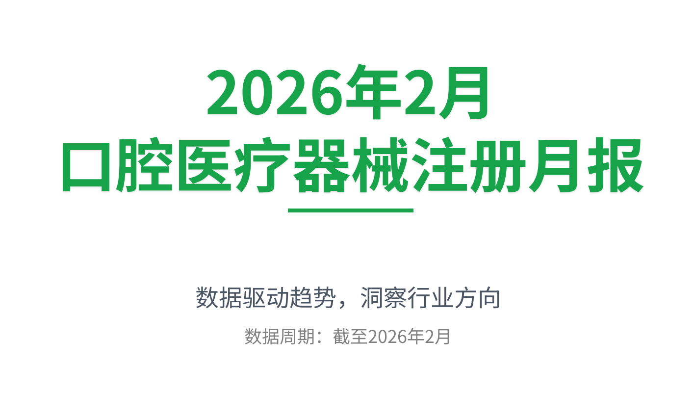 Medical device registration data serves as a crucial reference for observing the progress of domestic production and shifts in clinical demand structures. In February 2026, a total of 20 dental medical device registrations were completed nationwide, unchanged from February 2025, representing a 0% year-on-year change and a 33.3% month-on-month increase. The registration volume rebounded from the low point in January to the recent normal operating range but remained below the average of the past 14 months (25.3 items/month).