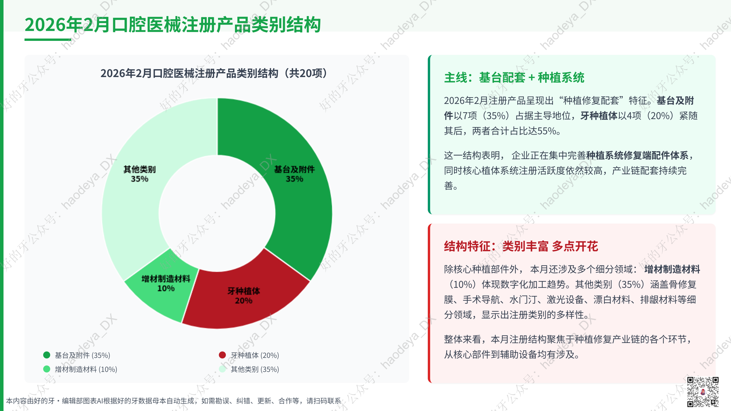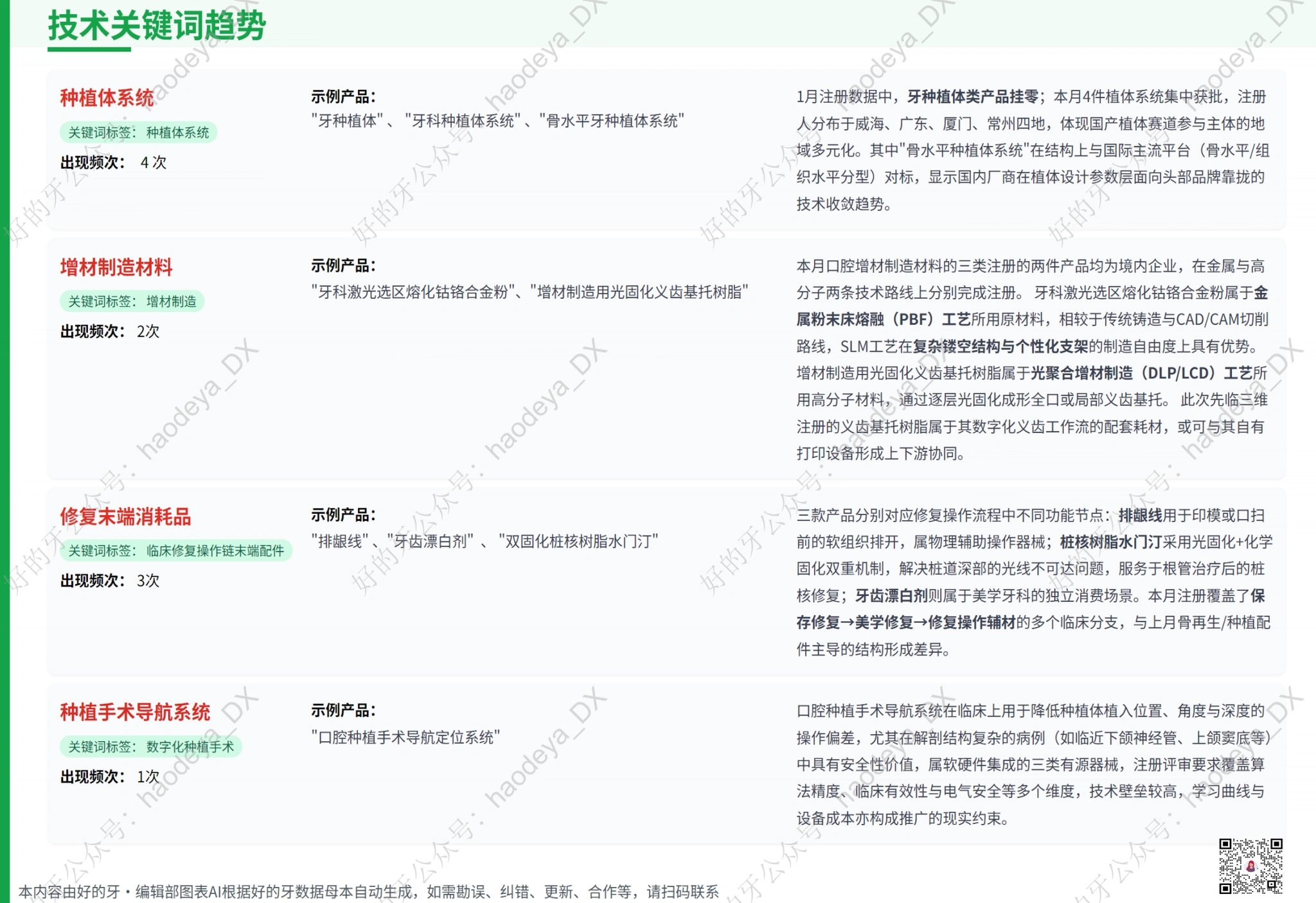 From a product structure perspective, abutments and accessories topped this month's registration list with 7 items, covering three tiers: universal, custom-made, and machinable abutment blanks, with participation from both domestic and foreign companies. There were 4 dental implant system registrations, with registrants distributed across Weihai, Guangdong, Xiamen, and Changzhou, marking a relatively high number of domestic implant approvals for a single month recently. Two additive manufacturing materials completed registration, corresponding to metal powder bed fusion and photopolymerization process routes, respectively. Among them, dental selective laser melting cobalt-chromium alloy powder was one of the less common product types on this month's registration list. Additionally, Shanghai Yangshan Medical Technology Co., Ltd. (Shenzhen) completed the Class III registration for an oral implant surgical navigation and positioning system. Following a similar product from Fangtian Yichuang approved in January, this represents the consecutive launch of active devices integrating software and hardware in this category.